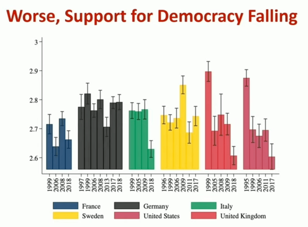 Da allora, si e’ purtroppo tornati indietro. I dati mostrano che ora molte nazioni stanno abbassando il loro livello di democrazia. Quel che e’ peggio, e’ che sta calando vertiginosamente il supporto verso la democrazia. Questo e’ il primo segnale, che può portare alla fine della democrazia stessa. Alcuni grafici qui sotto.
