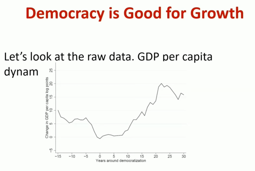 In primo luogo, la tesi che Acemoglu dimostra nei propri libri e’ la seguente: per creare prosperita’ e liberta’ abbiamo bisogno di istituzioni democratiche. Le istituzioni democratiche hanno bisogno del supporto popolare. Al fine di mantenere il supporto popolare, le istituzioni democratiche devono portare risultati in termini di crescita economica, redistribuzione della ricchezza prodotta, offerta di beni pubblici (come sanita’ e istruzione), lotta alla corruzione. Qui un grafico che mostra la dinamica della crescita del PIL rispetto al momento in cui una nazione diventa democratica (anno 0 nel grafico sotto).