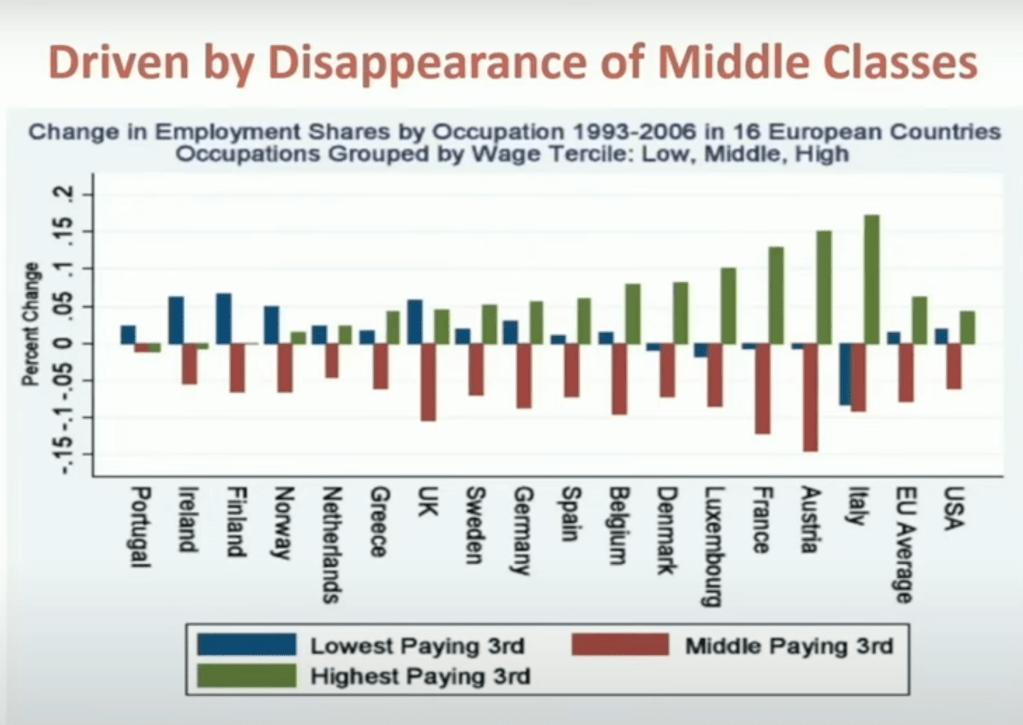 L’Ineguaglianza, specialmente rispetto alla caduta degli stipendi reali. Qui un grafico che mostra la perdita di posti di lavoro che una volta erano appannaggio della cosiddetta “classe media”. Sotto ancora, un grafico che mostra quanta ricchezza viene detenuta dal top 1% nei diversi paesi del mondo.