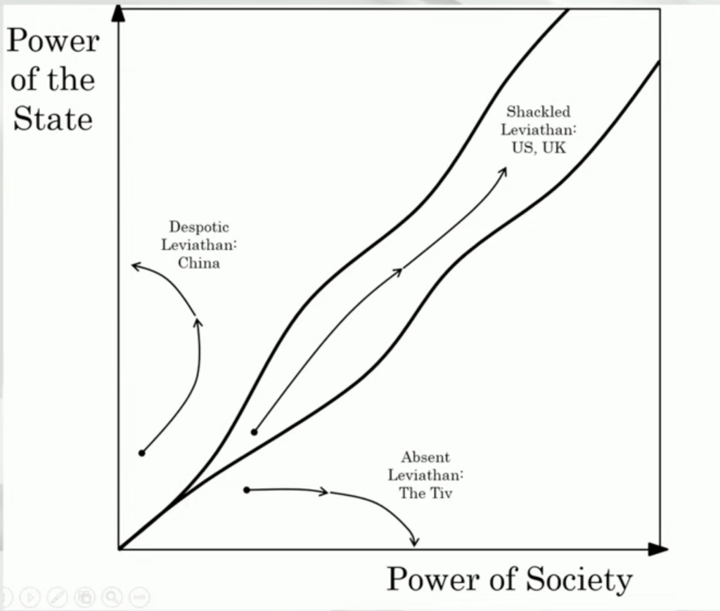 Nel grafico seguente, si identifica il processo dinamico tra le due forze in gioco secondo Acemoglu (e’ questo il famoso Narrow Corridor): il Potere della Societa’ (norme sociali, tradizioni, media, organizzazioni sociali) e il Potere dello Stato (istituzioni meramente politiche). Sono questi due poteri che bilanciandosi determinano la prosperita’, la crescita economica e la liberta’. Nel libro, Acemoglu fornisce dati e esempi reali di nazioni in vari momenti storici e posizioni geografiche.