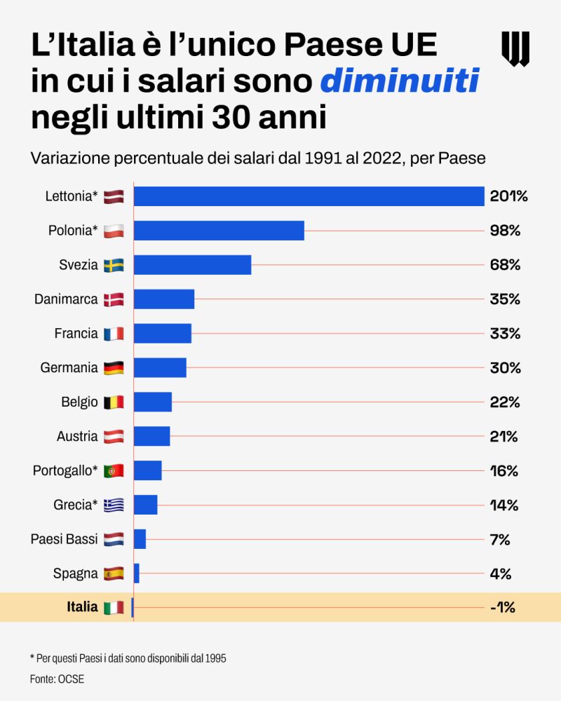 In tutto questo, trovo quasi divertente assistere alla situazione in Italia. Cioè, il nostro paese morente e’ diventato cosi autoreferenziale e immobile, da non accorgersi di quello che gli succede attorno. Gli italiani sono dei vecchi rimbambiti oramai incapaci di comprendere la realtà. Confrontati con i dati, spalancano la bocca e si rifugiano nella negazione dell’evidenza. Cosi, mi e’ toccato vedere come la reazione del nostro Paese ai numeri schiaccianti relativi agli stipendi reali dei paesi europei negli ultimi +30 anni abbiano generato reazioni scomposte. In sostanza, molti vecchi hanno sfidato i reumatismi e si sono alzati dalla loro poltrona per sbraitare contro l’evidenza empirica, per altro non sorprendente, che dimostra come l’Italia sia l’unico paese in Europa i cui stipendi siano scesi dal 1990 al 2022. Le ragioni del disastro sono arcinote agli economisti, e ne abbiamo parlato diverse volte in questo blog.